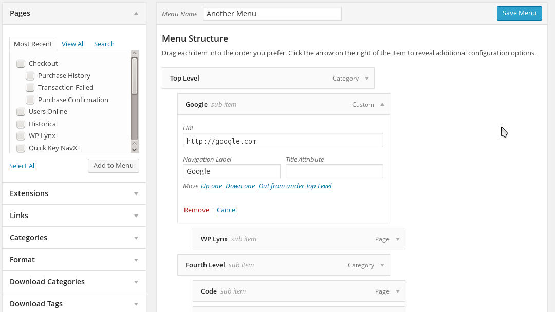 April 5th, 2014 Menu Magic Another Menu Setup by John Havlik “Another Menu” Setup/Structure Menu Magic supports not only basic WordPress types (Post Types and taxonomies) but also “Custom” Menu entities.
